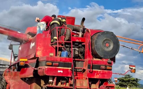 Segundo informações da corporação, o fogo teria se iniciado na região do motor da colhedeira, espalhando-se rapidamente para o compartimento interno da estrutura. A situação exigia resposta imediata para evitar que o maquinário fosse completamente consumido pelas chamas, o que representaria um grande prejuízo ao produtor rural e à produção local.