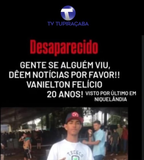 Um jovem de apenas 20 anos, identificado como Vanielton Felício Aparecido, residente no povoado da Vila Taveira, conhecido como Faz Tudo, está desaparecido desde o último sábado. A família está desesperada e o caso já foi comunicado às autoridades competentes.