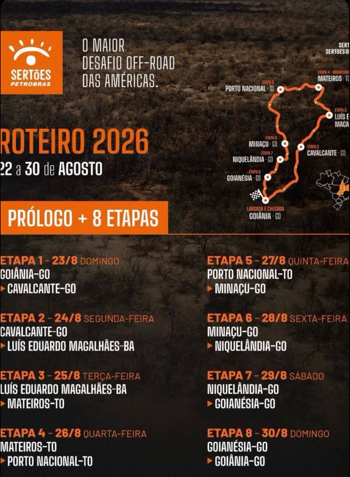 Nos dias 28 e 29 de agosto de 2026, Niquelândia será palco das etapas 6 e 7, recebendo pilotos, equipes e toda a emoção de uma das maiores competições off-road do mundo! 🏍️🚗💨