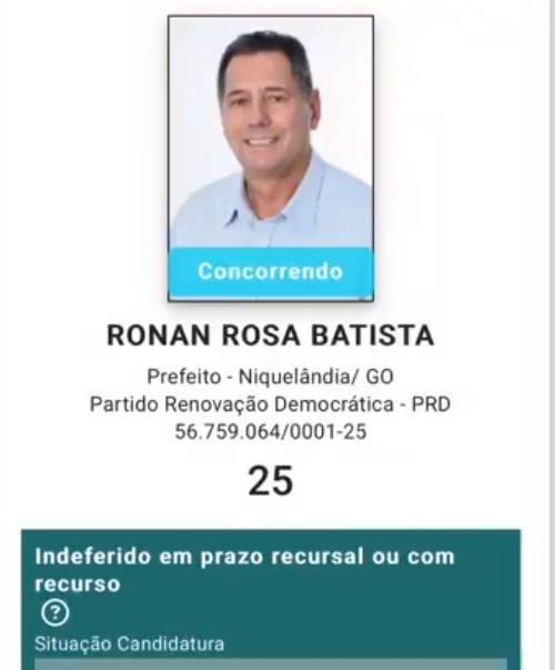 Apesar da decisão ainda caber recurso ao Tribunal Regional Eleitoral (TRE), o registro de candidatura de Ronan Batista foi indeferido, impossibilitando-o, até o momento, de concorrer ao cargo de prefeito nas eleições de 2024 em Niquelândia.