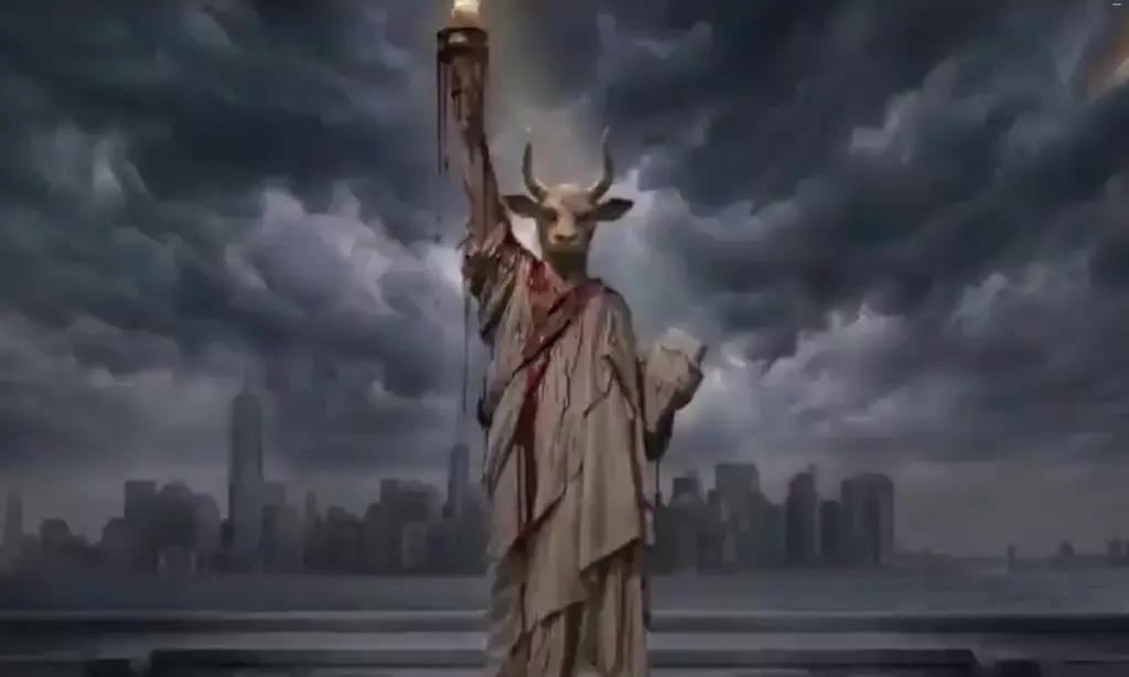 Nos segundos finais, o vídeo chama ainda mais atenção: uma simulação simbólica mostra um míssil atingindo a Estátua da Liberdade, que aparece com traços alterados para uma figura demonizada — um claro elemento de propaganda com forte carga ideológica.